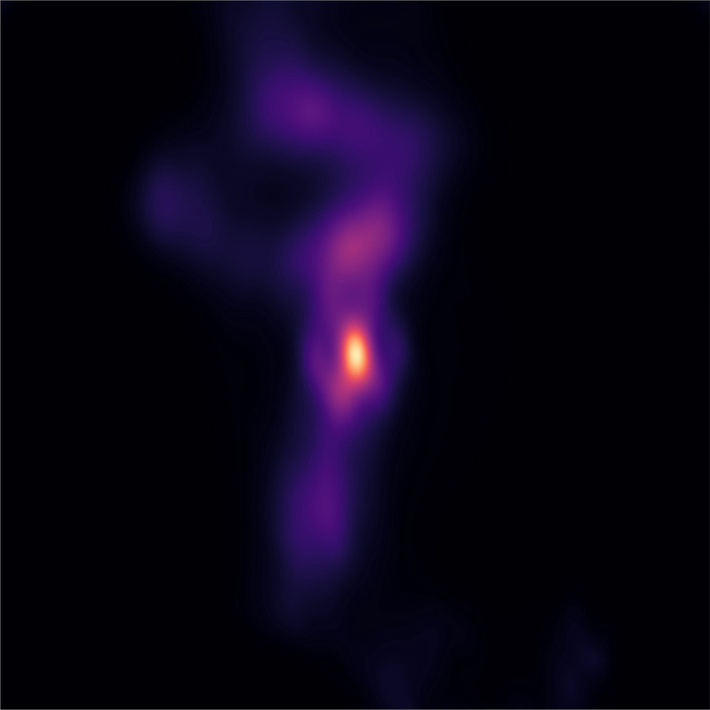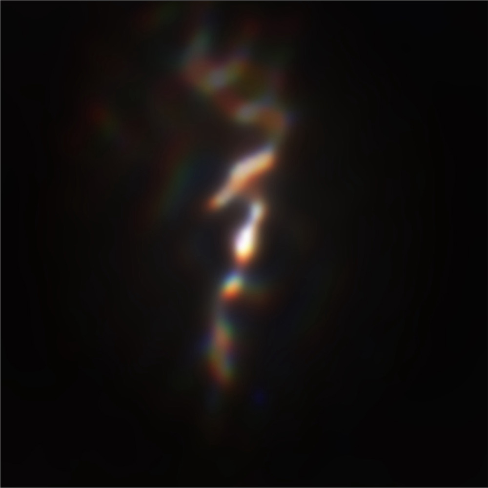 The jet from the black hole in the galaxy NGC 1068. First image (purple) is from the ground-based Large Binocular Telescope Interferometer, while the second is the same jet in false colour, as seen by AMI from Webb. Image: Max Charles